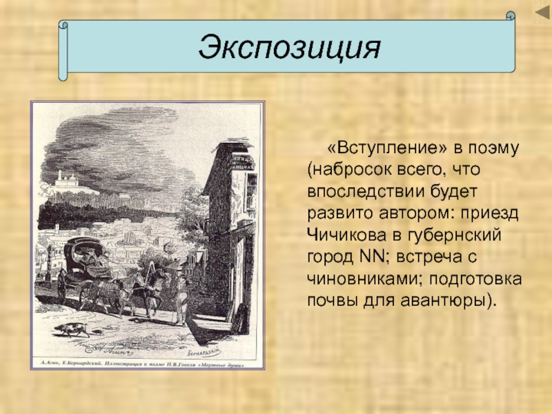 будет развито автором: приезд Чичикова в губернский город NN; встреча с чиновниками; подготовка почвы для авантюры).
