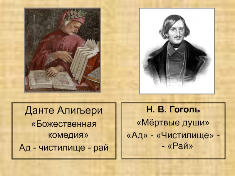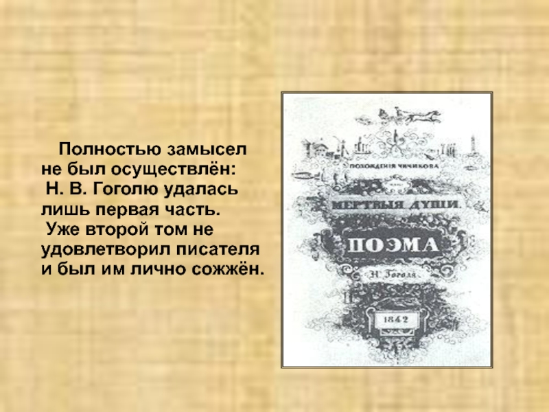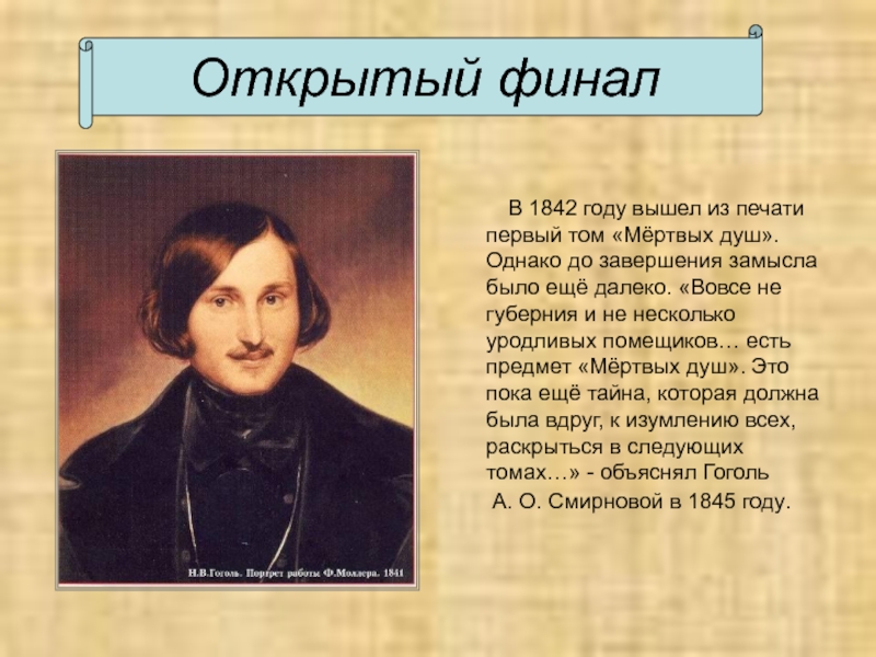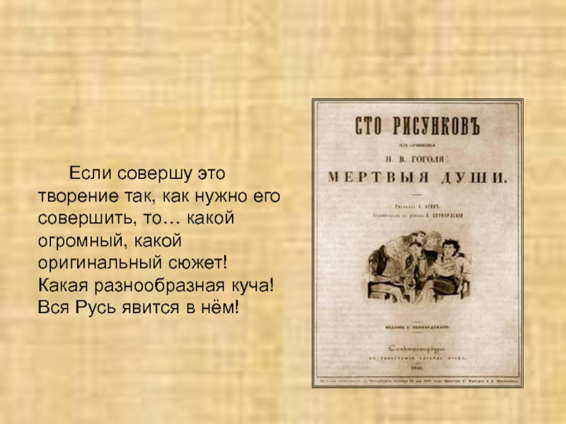 первый том «Мёртвых душ». Однако до завершения замысла было ещё далеко. «Вовсе не губерния и не несколько уродливых помещиков… есть предмет «Мёртвых душ». Это пока ещё тайна, которая должна была вдруг, к изумлению всех, раскрыться в следующих томах…» - объяснял Гоголь