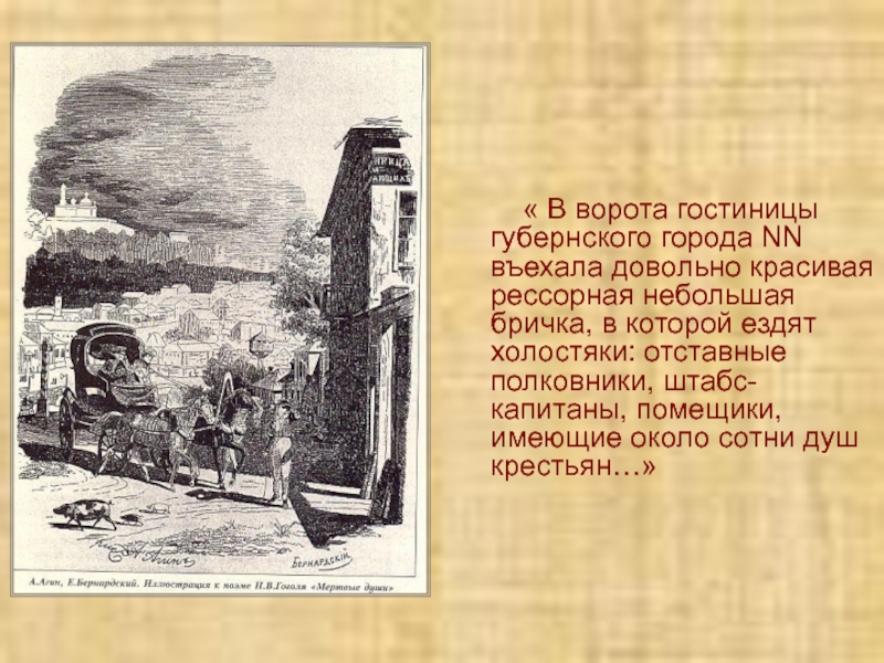 города NN въехала довольно красивая рессорная небольшая бричка, в которой ездят холостяки: отставные полковники, штабс-капитаны, помещики, имеющие около сотни душ крестьян…»