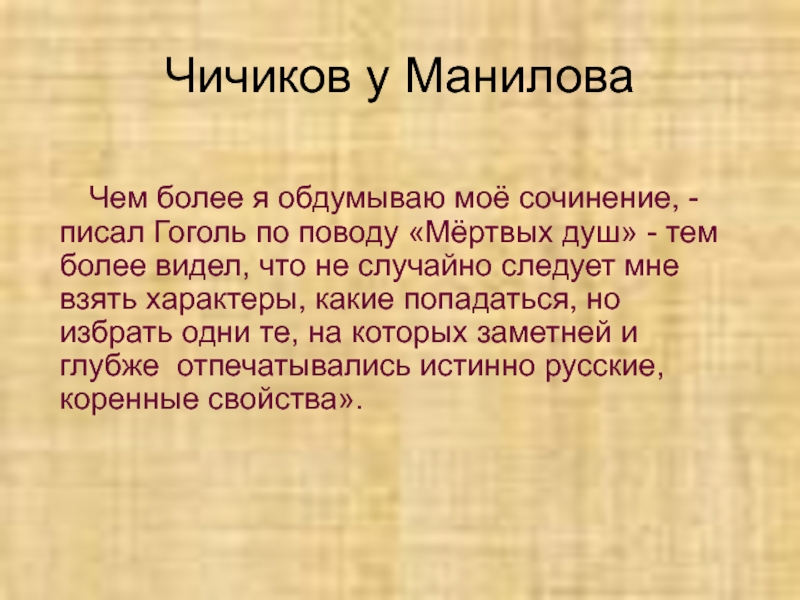 - писал Гоголь по поводу «Мёртвых душ» - тем более видел, что не случайно следует мне взять характеры, какие попадаться, но избрать одни те, на которых заметней и глубже отпечатывались истинно русские, коренные свойства».
