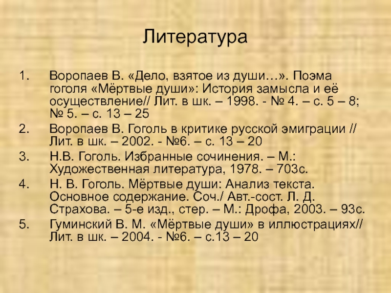 Н. В. Гоголь. Мёртвые души: Анализ текста. Основное содержание. Соч./ Авт.-сост. Л. Д. Страхова. – 5-е изд., стер. – М.: Дрофа, 2003. – 93с.