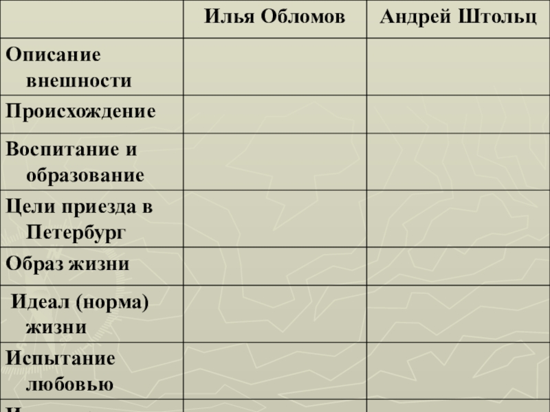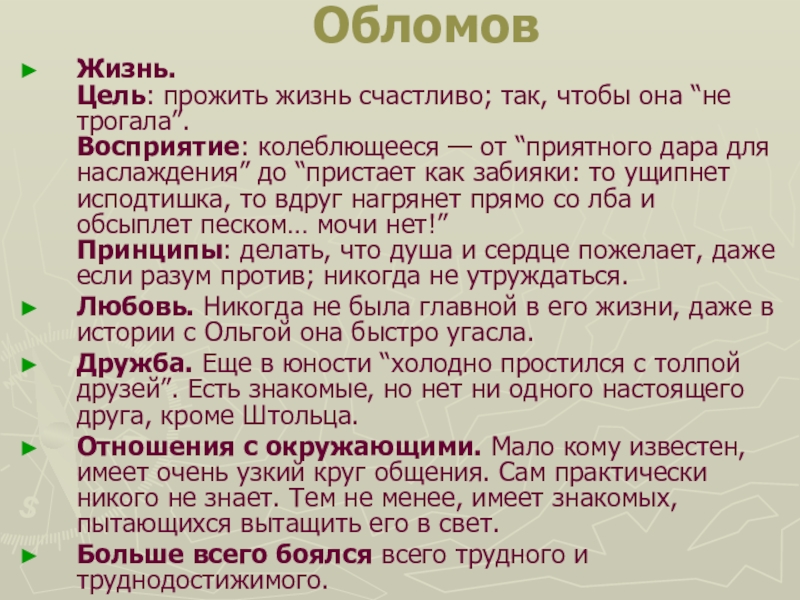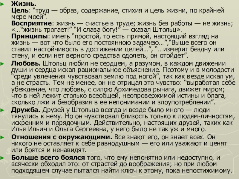 Дружба. Друзей у Штольца всегда и везде было много — люди тянулись к нему. Но он чувствовал близость только к людям-личностям, искренним и порядочным. Действительно, настоящих друзей, таких как Илья Ильич и Ольга Сергеевна, у него было не так уж и много.