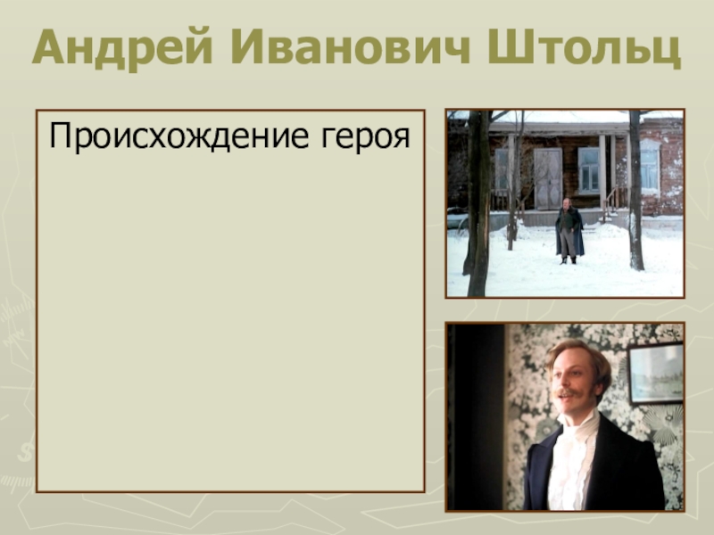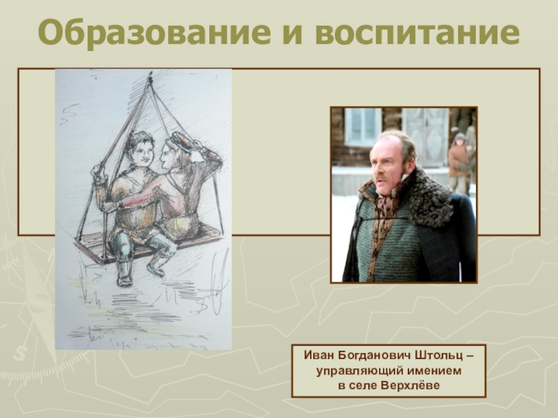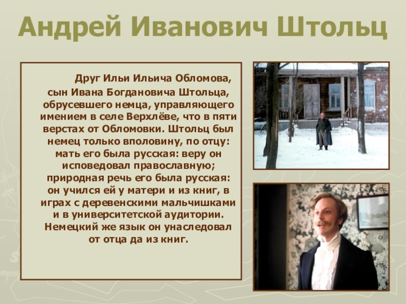 Ивана Богдановича Штольца, обрусевшего немца, управляющего имением в селе Верхлёве, что в пяти верстах от Обломовки. Штольц был немец только вполовину, по отцу: мать его была русская: веру он исповедовал православную; природная речь его была русская: он учился ей у матери и из книг, в играх с деревенскими мальчишками и в университетской аудитории. Немецкий же язык он унаследовал от отца да из книг.