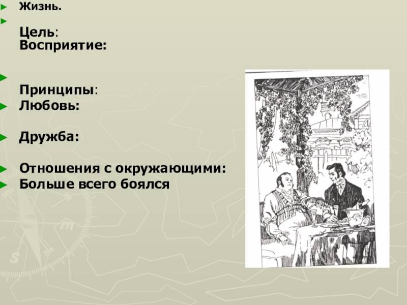 Принципы: иметь “простой, то есть прямой, настоящий взгляд на жизнь — вот что было его постоянною задачею…”,“Выше всего он ставил настойчивость в достижении целей…”, “…измерит бездну или стену, и если нет верного средства одолеть, он отойдет”.