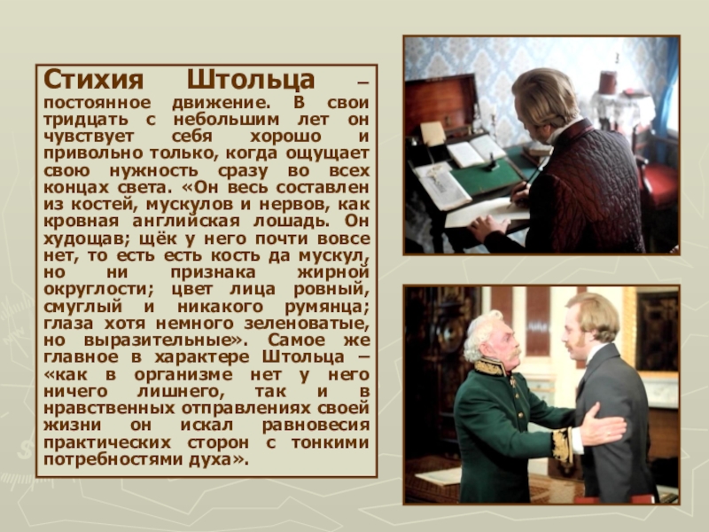 Слайд 16Стихия Штольца – постоянное движение. В свои тридцать с небольшим лет