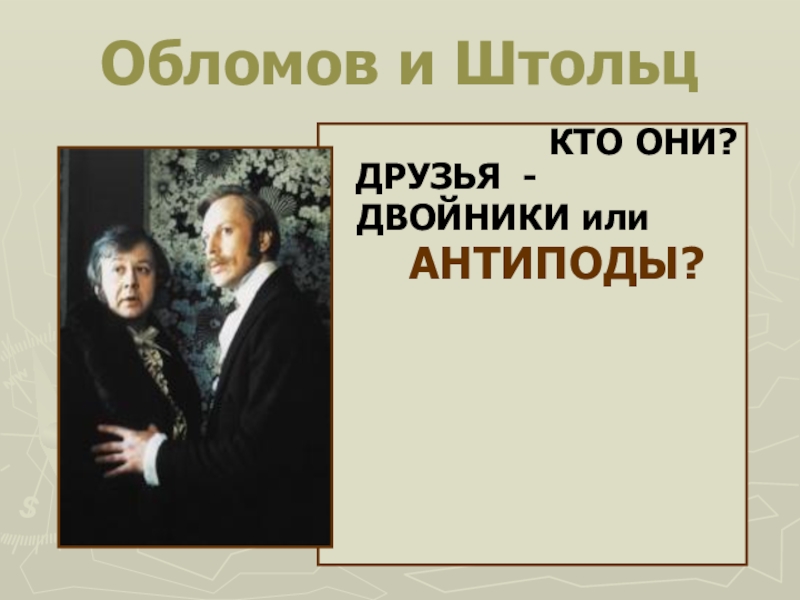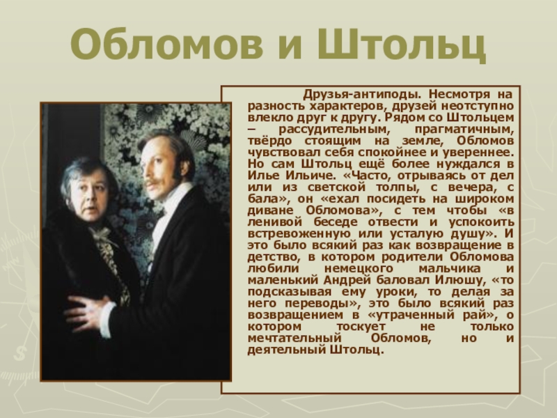 на разность характеров, друзей неотступно влекло друг к другу. Рядом со Штольцем – рассудительным, прагматичным, твёрдо стоящим на земле, Обломов чувствовал себя спокойнее и увереннее. Но сам Штольц ещё более нуждался в Илье Ильиче. «Часто, отрываясь от дел или из светской толпы, с вечера, с бала», он «ехал посидеть на широком диване Обломова», с тем чтобы «в ленивой беседе отвести и успокоить встревоженную или усталую душу». И это было всякий раз как возвращение в детство, в котором родители Обломова любили немецкого мальчика и маленький Андрей баловал Илюшу, «то подсказывая ему уроки, то делая за него переводы», это было всякий раз возвращением в «утраченный рай», о котором тоскует не только мечтательный Обломов, но и деятельный Штольц.