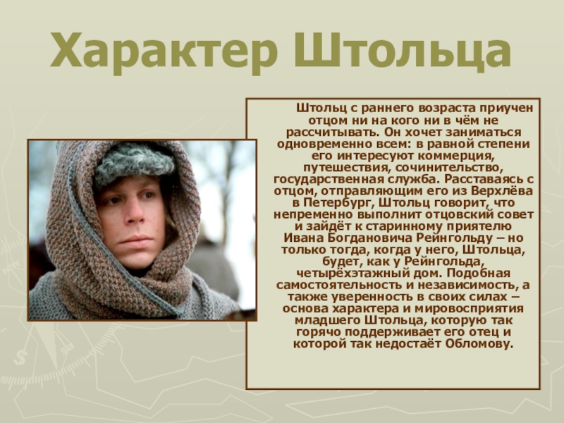 приучен отцом ни на кого ни в чём не рассчитывать. Он хочет заниматься одновременно всем: в равной степени его интересуют коммерция, путешествия, сочинительство, государственная служба. Расставаясь с отцом, отправляющим его из Верхлёва в Петербург, Штольц говорит, что непременно выполнит отцовский совет и зайдёт к старинному приятелю Ивана Богдановича Рейнгольду – но только тогда, когда у него, Штольца, будет, как у Рейнгольда, четырёхэтажный дом. Подобная самостоятельность и независимость, а также уверенность в своих силах – основа характера и мировосприятия младшего Штольца, которую так горячо поддерживает его отец и которой так недостаёт Обломову.