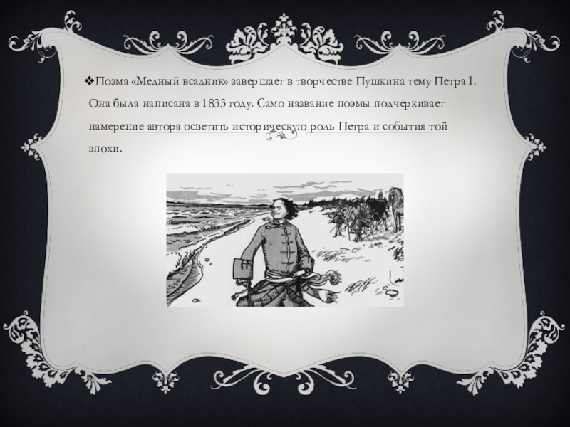 Слайд 2Поэма «Медный всадник» завершает в творчестве Пушкина тему Петра I. Она