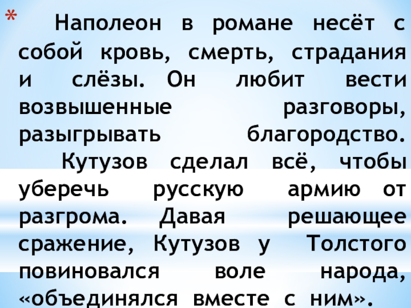 и слёзы. Он любит вести возвышенные разговоры, разыгрывать благородство. Кутузов сделал всё, чтобы уберечь русскую армию от разгрома. Давая решающее сражение, Кутузов у Толстого повиновался воле народа, «объединялся вместе с ним».