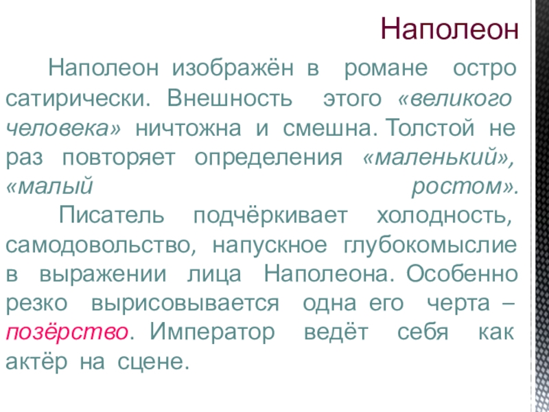 Наполеон изображён в романе остро сатирически. Внешность этого «великого человека» ничтожна и смешна. Толстой не раз повторяет определения «маленький», «малый ростом». Писатель подчёркивает холодность, самодовольство, напускное глубокомыслие в выражении лица Наполеона. Особенно резко вырисовывается одна его черта – позёрство. Император ведёт себя как актёр на сцене.
