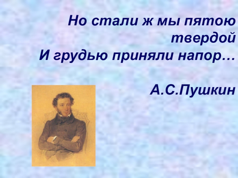 Но стали ж мы пятою   твердой И грудью приняли напор…