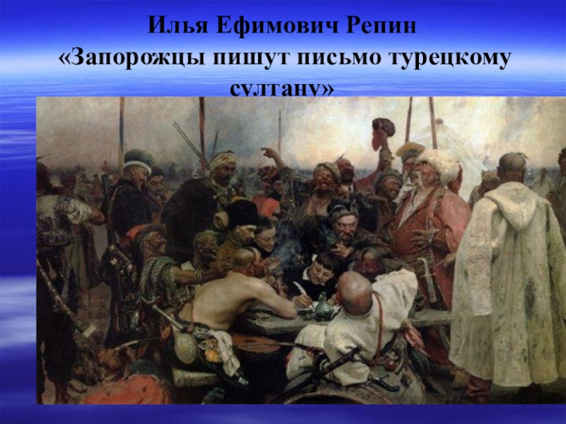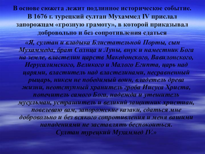 «Я, султан и владыка Блистательной Порты, сын Мухаммеда, брат Солнца и Луны, внук и наместник Бога на земле, властелин царств Македонского, Вавилонского, Иерусалимского, Великого и Малого Египта, царь над царями, властитель над властелинами, несравненный рыцарь, никем не победимый воин, владетель древа жизни, неотступный хранитель гроба Иисуса Христа, попечитель самого Бога, надежда и утешитель мусульман, устрашитель и великий защитник христиан, повелеваю вам, запорожские казаки, сдаться мне добровольно и без всякого сопротивления и меня вашими нападениями не заставлять беспокоиться.