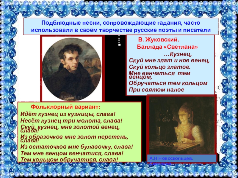 Слайд 16Подблюдные песни, сопровождающие гадания, часто использовали в своём творчестве русские поэты