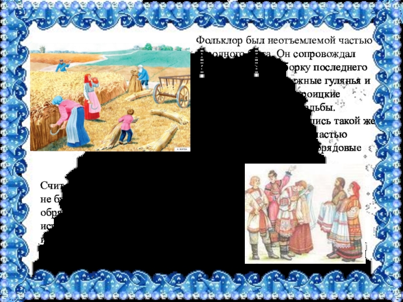 Слайд 5Фольклор был неотъемлемой частью народного быта. Он сопровождал первую пахоту и
