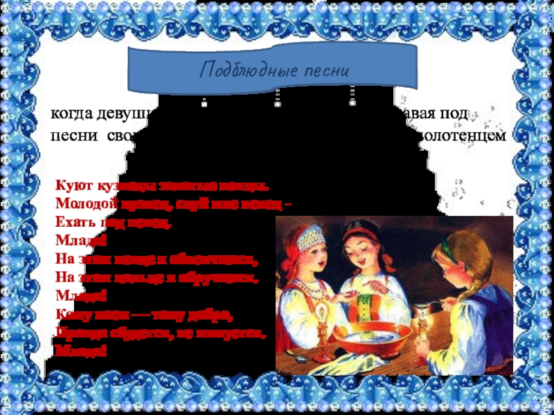 когда девушки угадывали свою судьбу , доставая под песни свои украшения из блюда , накрытого полотенцем