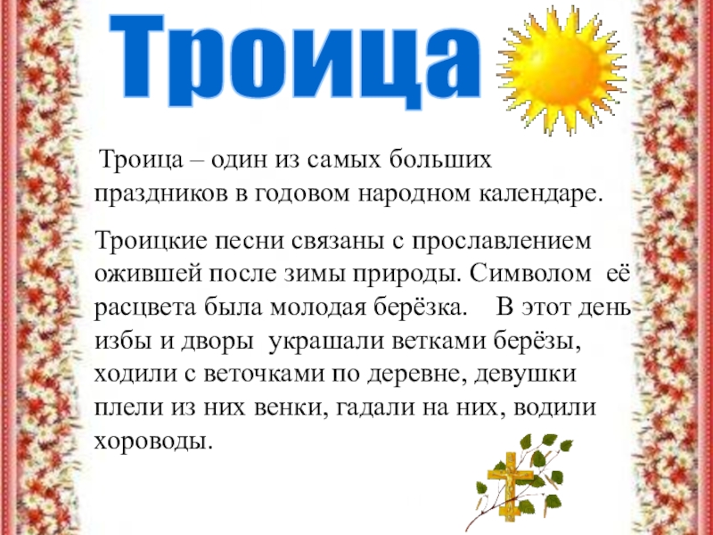 Троицкие песни связаны с прославлением ожившей после зимы природы. Символом её расцвета была молодая берёзка. В этот день избы и дворы украшали ветками берёзы, ходили с веточками по деревне, девушки плели из них венки, гадали на них, водили хороводы.