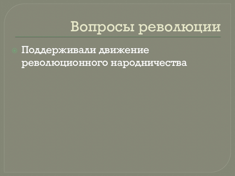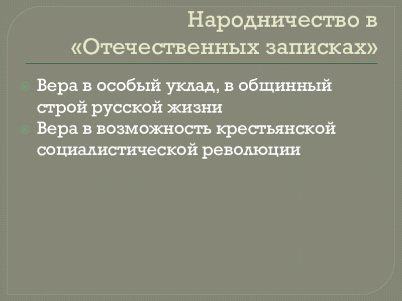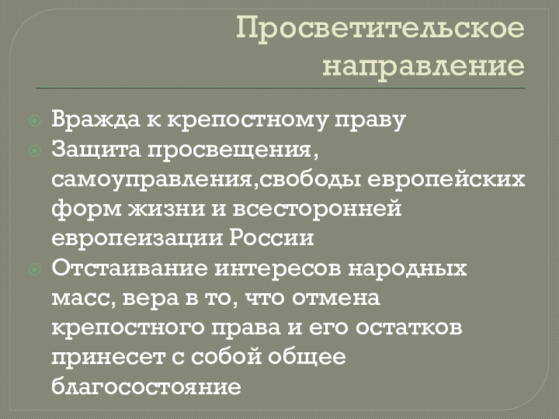Отстаивание интересов народных масс, вера в то, что отмена крепостного права и его остатков принесет с собой общее благосостояние