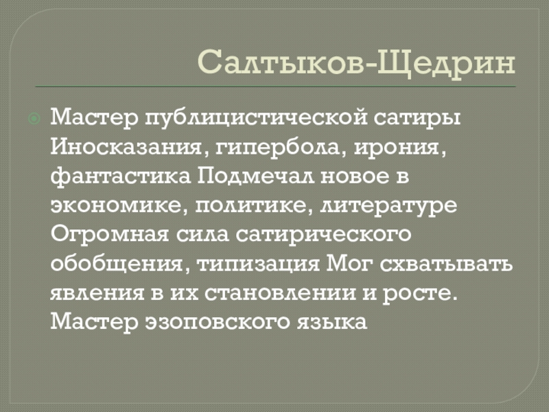 политике, литературе Огромная сила сатирического обобщения, типизация Мог схватывать явления в их становлении и росте. Мастер эзоповского языка