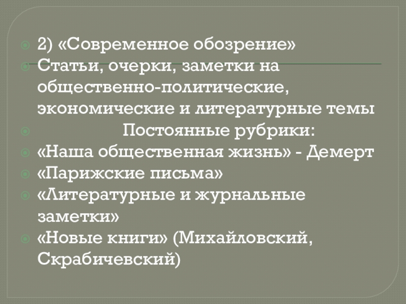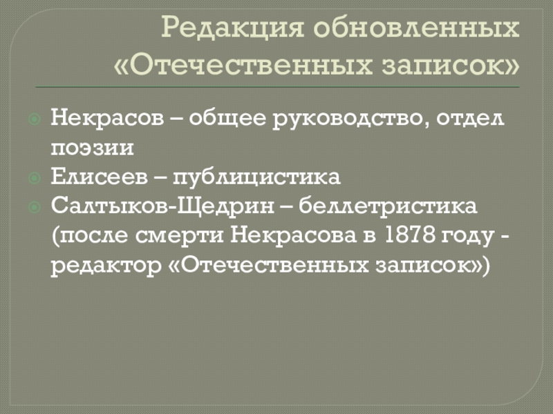 – беллетристика (после смерти Некрасова в 1878 году -редактор «Отечественных записок»)