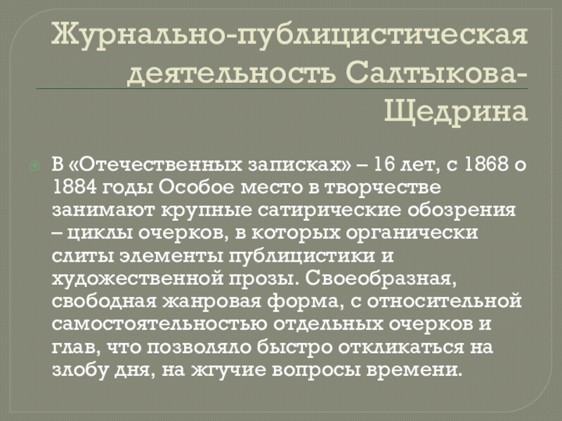 1884 годы Особое место в творчестве занимают крупные сатирические обозрения – циклы очерков, в которых органически слиты элементы публицистики и художественной прозы. Своеобразная, свободная жанровая форма, с относительной самостоятельностью отдельных очерков и глав, что позволяло быстро откликаться на злобу дня, на жгучие вопросы времени.