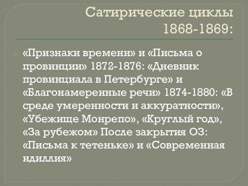в Петербурге» и «Благонамеренные речи» 1874-1880: «В среде умеренности и аккуратности», «Убежище Монрепо», «Круглый год», «За рубежом» После закрытия ОЗ: «Письма к тетеньке» и «Современная идиллия»