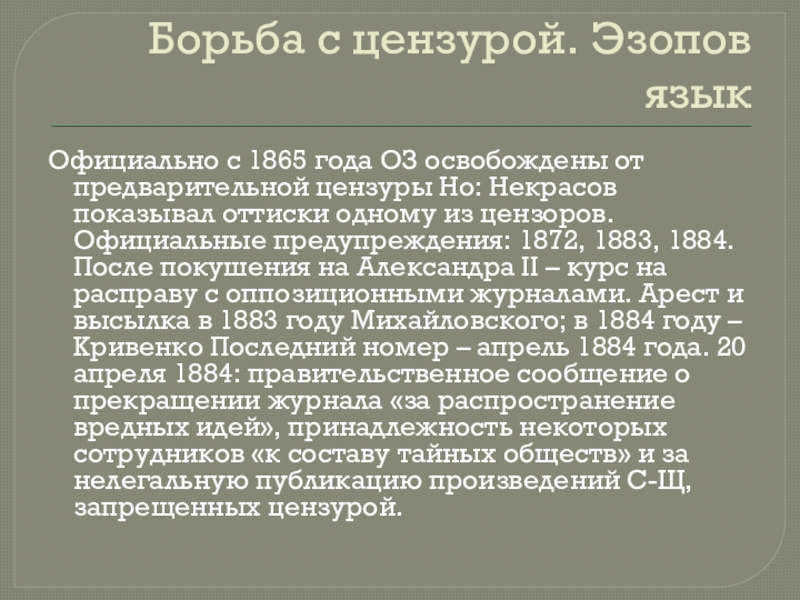 от предварительной цензуры Но: Некрасов показывал оттиски одному из цензоров. Официальные предупреждения: 1872, 1883, 1884. После покушения на Александра II – курс на расправу с оппозиционными журналами. Арест и высылка в 1883 году Михайловского; в 1884 году – Кривенко Последний номер – апрель 1884 года. 20 апреля 1884: правительственное сообщение о прекращении журнала «за распространение вредных идей», принадлежность некоторых сотрудников «к составу тайных обществ» и за нелегальную публикацию произведений С-Щ, запрещенных цензурой.