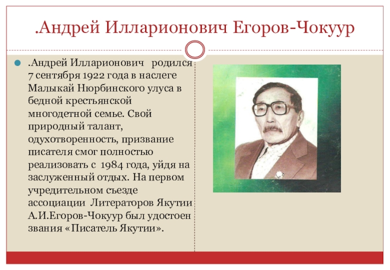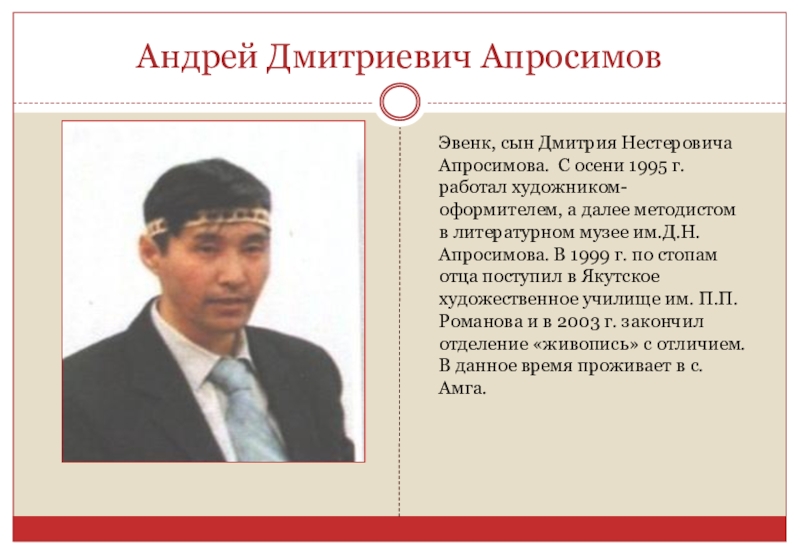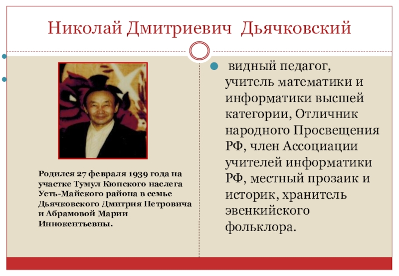 Родился 27 февраля 1939 года на участке Тумул Кюпского наслега Усть-Майского района в семье Дьячковского Дмитрия Петровича и Абрамовой Марии Иннокентьевны.