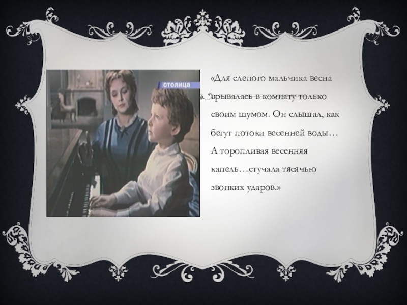 Слайд 15«Для слепого мальчика весна врывалась в комнату только своим шумом. Он