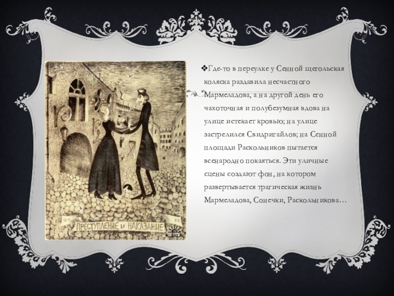 Слайд 23Где-то в переулке у Сенной щегольская коляска раздавила несчастного Мармеладова, а