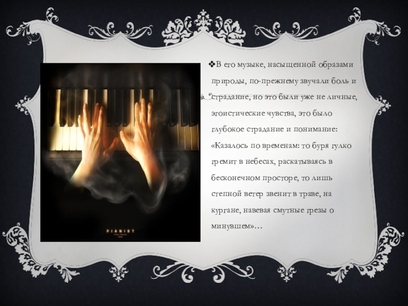 Слайд 18В его музыке, насыщенной образами природы, по-прежнему звучали боль и страдание,