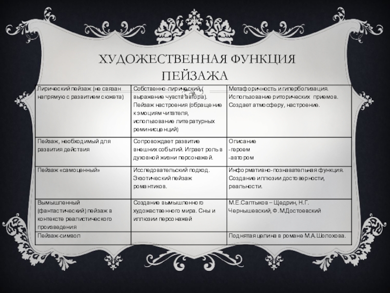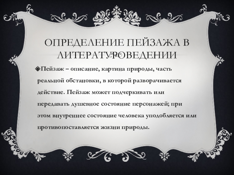 в которой разворачивается действие. Пейзаж может подчеркивать или передавать душевное состояние персонажей; при этом внутреннее состояние человека уподобляется или противопоставляется жизни природы.