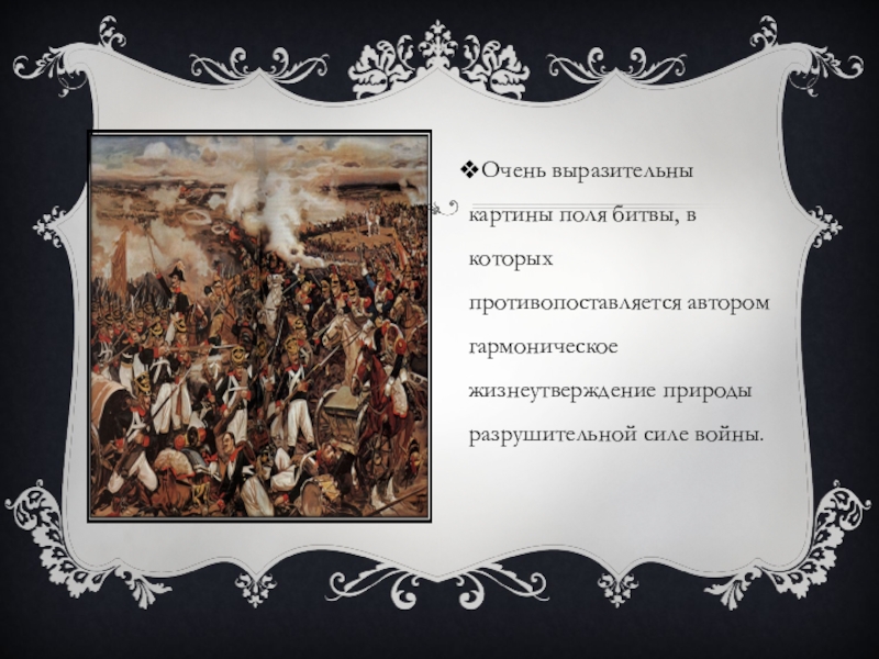 Слайд 28Очень выразительны картины поля битвы, в которых противопоставляется автором гармоническое жизнеутверждение