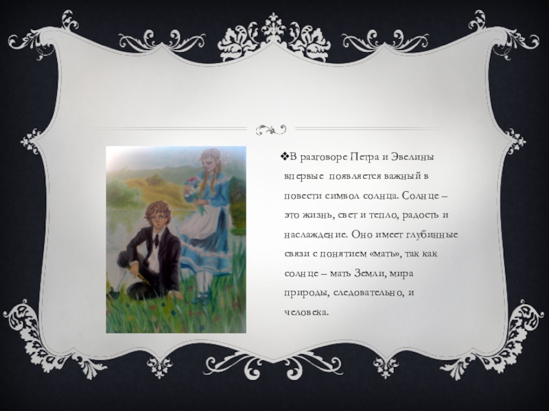 Слайд 16В разговоре Петра и Эвелины впервые появляется важный в повести символ