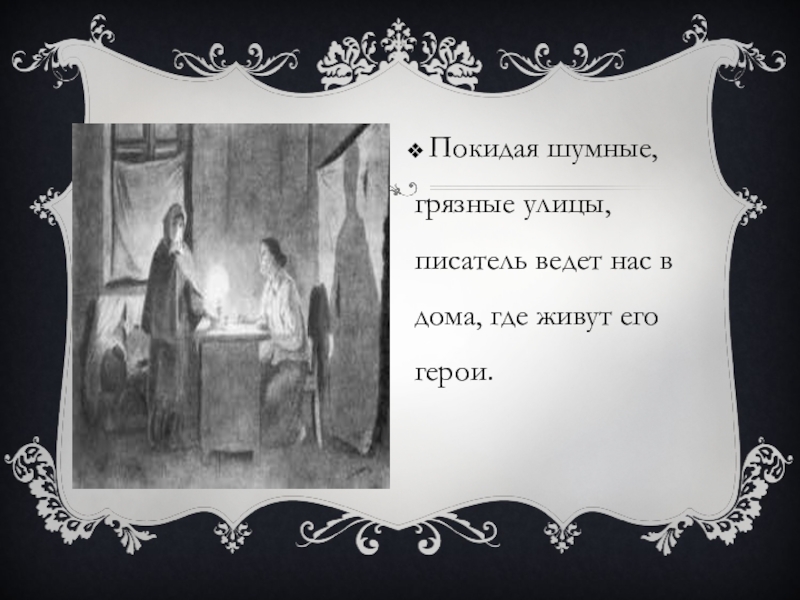 Слайд 24 Покидая шумные, грязные улицы, писатель ведет нас в дома, где