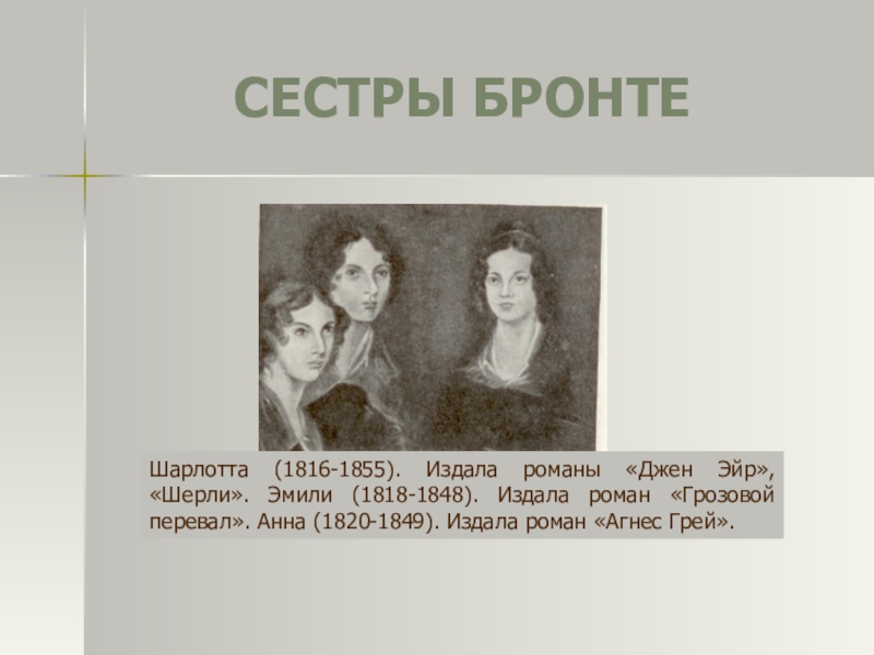 Шарлотта (1816-1855). Издала романы «Джен Эйр», «Шерли». Эмили (1818-1848). Издала