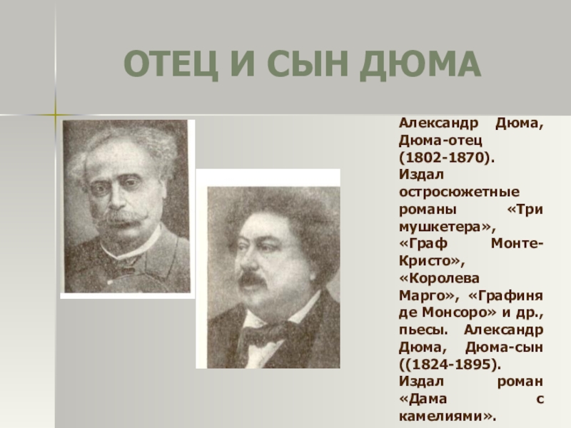 мушкетера», «Граф Монте-Кристо», «Королева Марго», «Графиня де Монсоро» и др., пьесы. Александр Дюма, Дюма-сын ((1824-1895). Издал роман «Дама с камелиями».