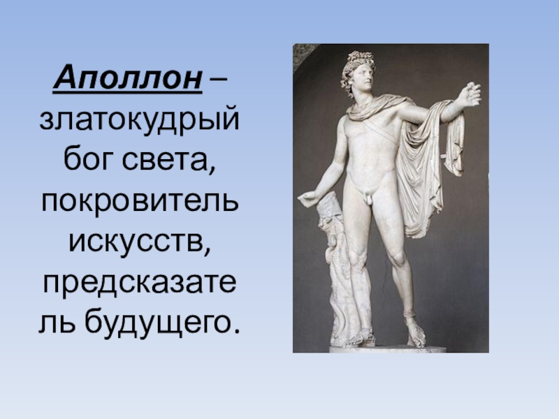 Слайд 4Аполлон – златокудрый бог света, покровитель искусств, предсказатель будущего.