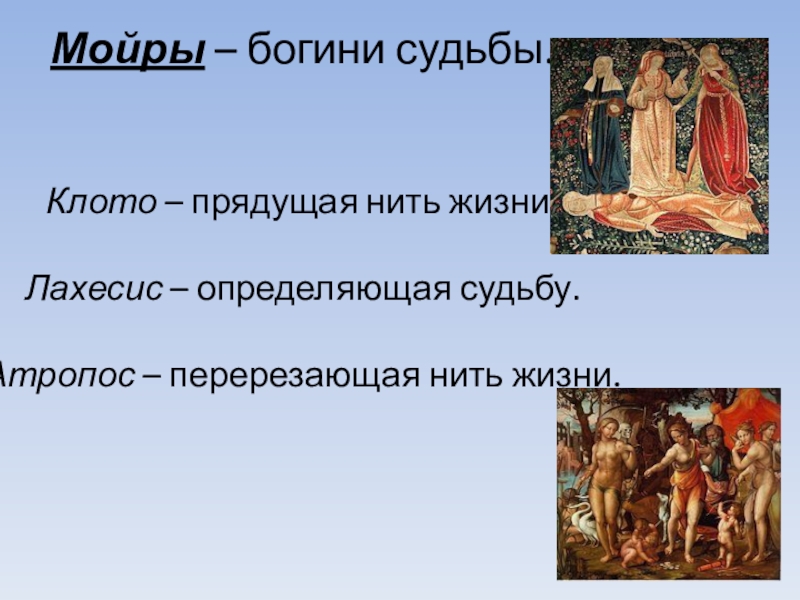Слайд 15Мойры – богини судьбы. Клото – прядущая нить жизни. Лахесис – определяющая судьбу. Атропос