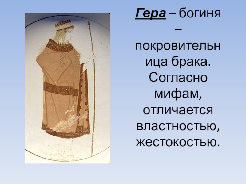 Слайд 3Гера – богиня – покровительница брака. Согласно мифам, отличается властностью, жестокостью.