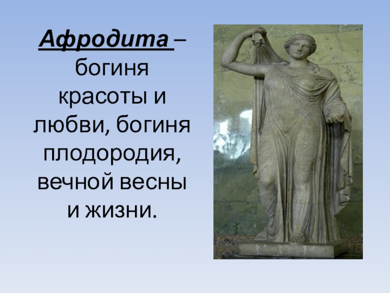 Слайд 6Афродита – богиня красоты и любви, богиня плодородия, вечной весны и