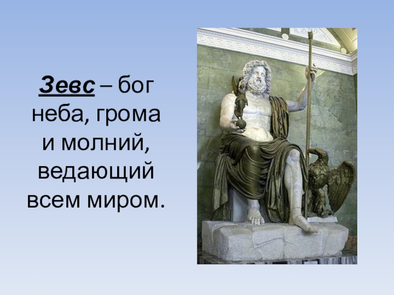 Слайд 2Зевс – бог неба, грома и молний, ведающий всем миром.