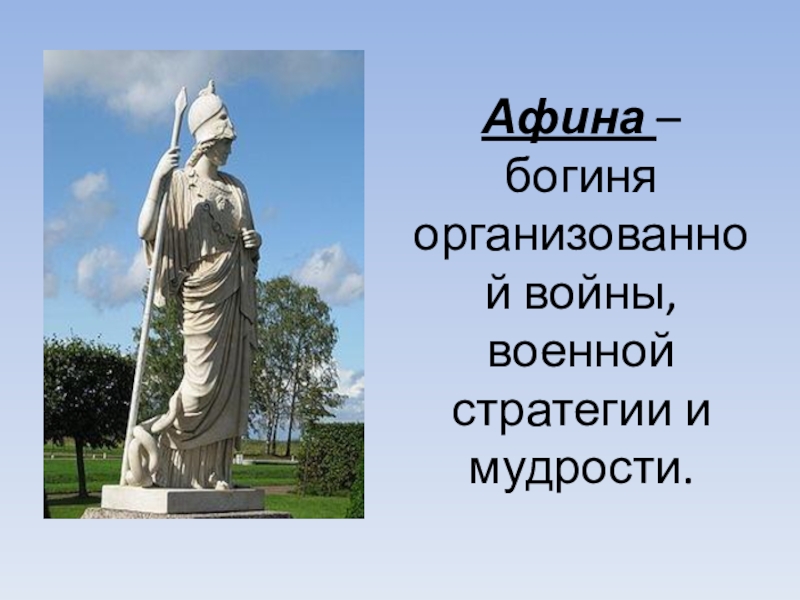 Слайд 7Афина – богиня организованной войны, военной стратегии и мудрости.