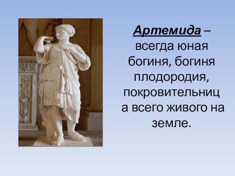 Слайд 5Артемида – всегда юная богиня, богиня плодородия, покровительница всего живого на