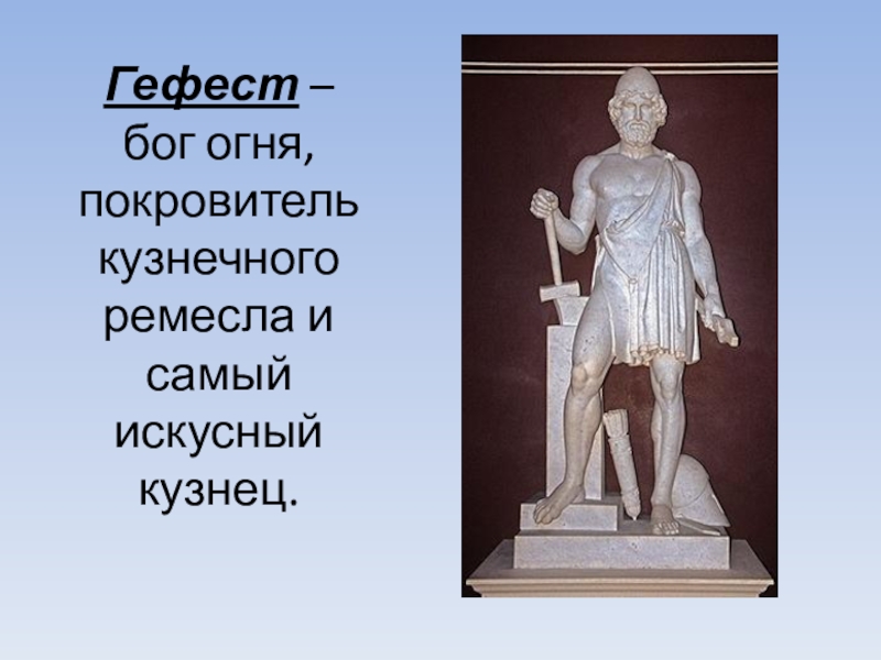 Слайд 8Гефест – бог огня, покровитель кузнечного ремесла и самый искусный кузнец.