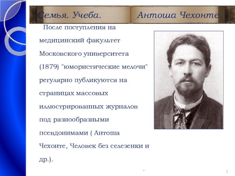 После поступления на медицинский факультет Московского университета (1879) "юмористические мелочи" регулярно публикуются на страницах массовых иллюстрированных журналов под разнообразными псевдонимами ( Антоша Чехонте, Человек без селезенки и др.).