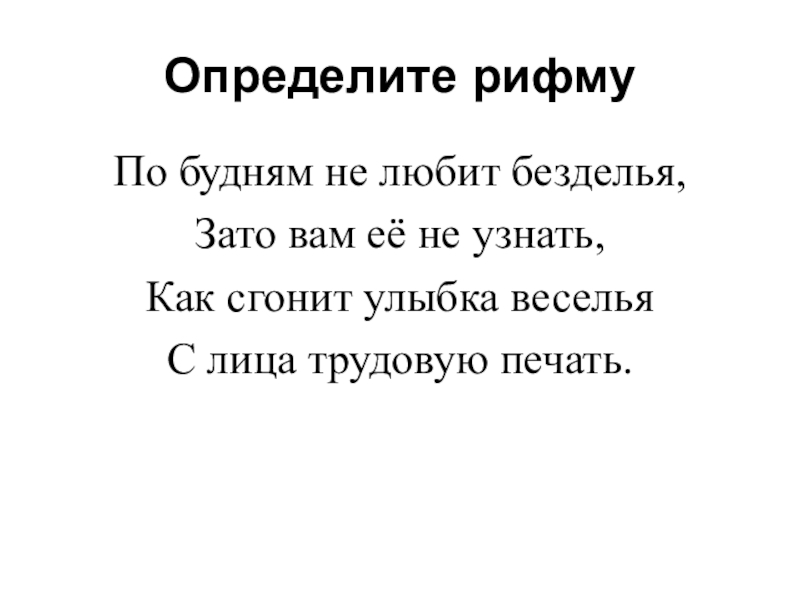 Определите рифмуПо будням не любит безделья,Зато вам её не узнать,Как сгонит улыбка весельяС лица трудовую печать.
