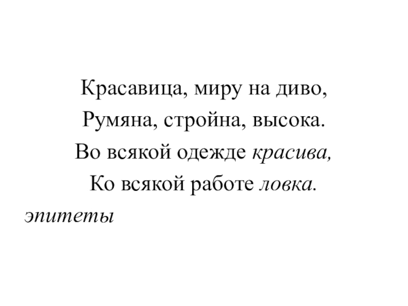 Красавица, миру на диво,Румяна, стройна, высока.Во всякой одежде красива,Ко всякой работе ловка.эпитеты