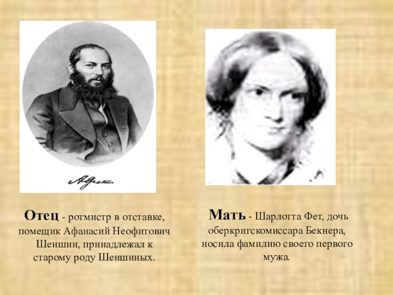 Слайд 4Отец - ротмистр в отставке, помещик Афанасий Неофитович Шеншин, принадлежал к