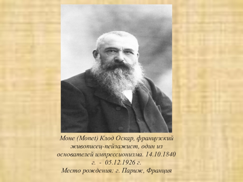 Слайд 7Моне (Monet) Клод Оскар, французский живописец-пейзажист, один из основателей импрессионизма. 14.10.1840