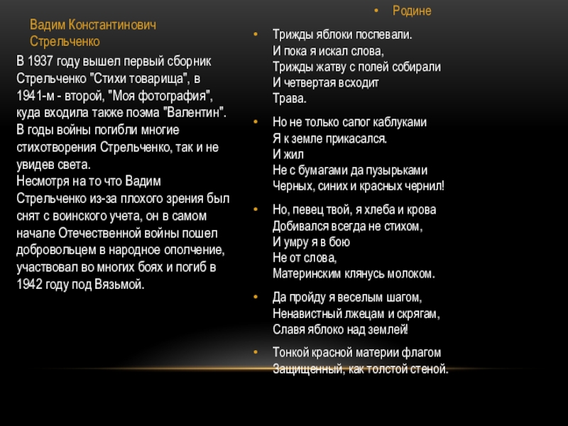 В 1937 году вышел первый сборник Стрельченко "Стихи товарища", в 1941-м - второй, "Моя фотография", куда входила также поэма "Валентин". В годы войны погибли многие стихотворения Стрельченко, так и не увидев света.